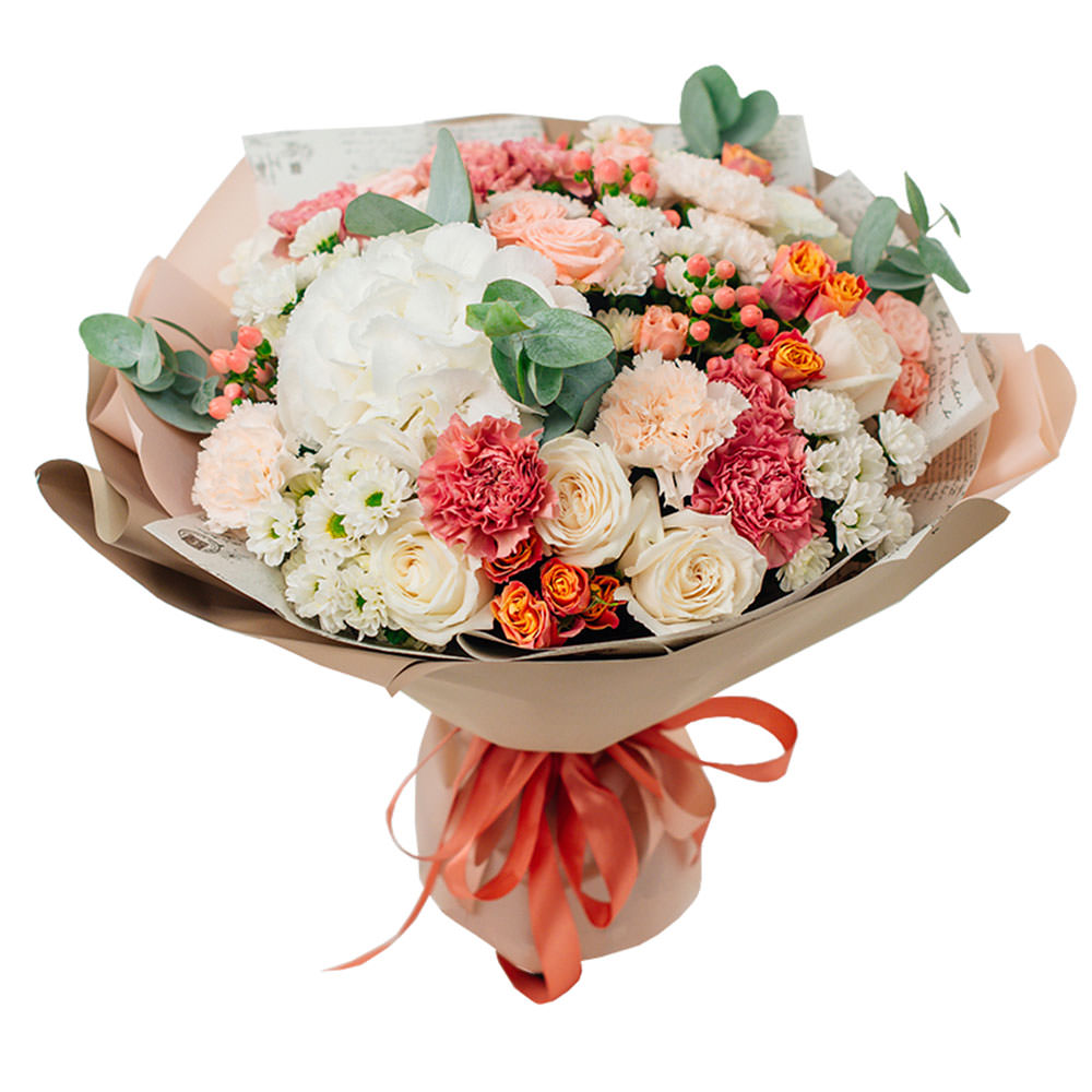Гортензия, гвоздика микс, роза кустовая, хризантема кустовая, роза, гиперикум, эвкалипт.