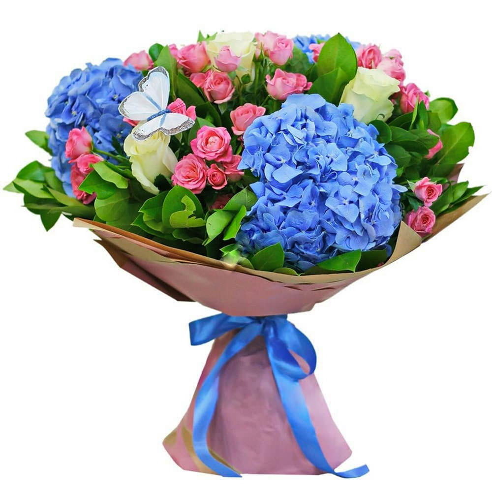 Гортензия, роза кустовая, роза одноголовая, зелень.