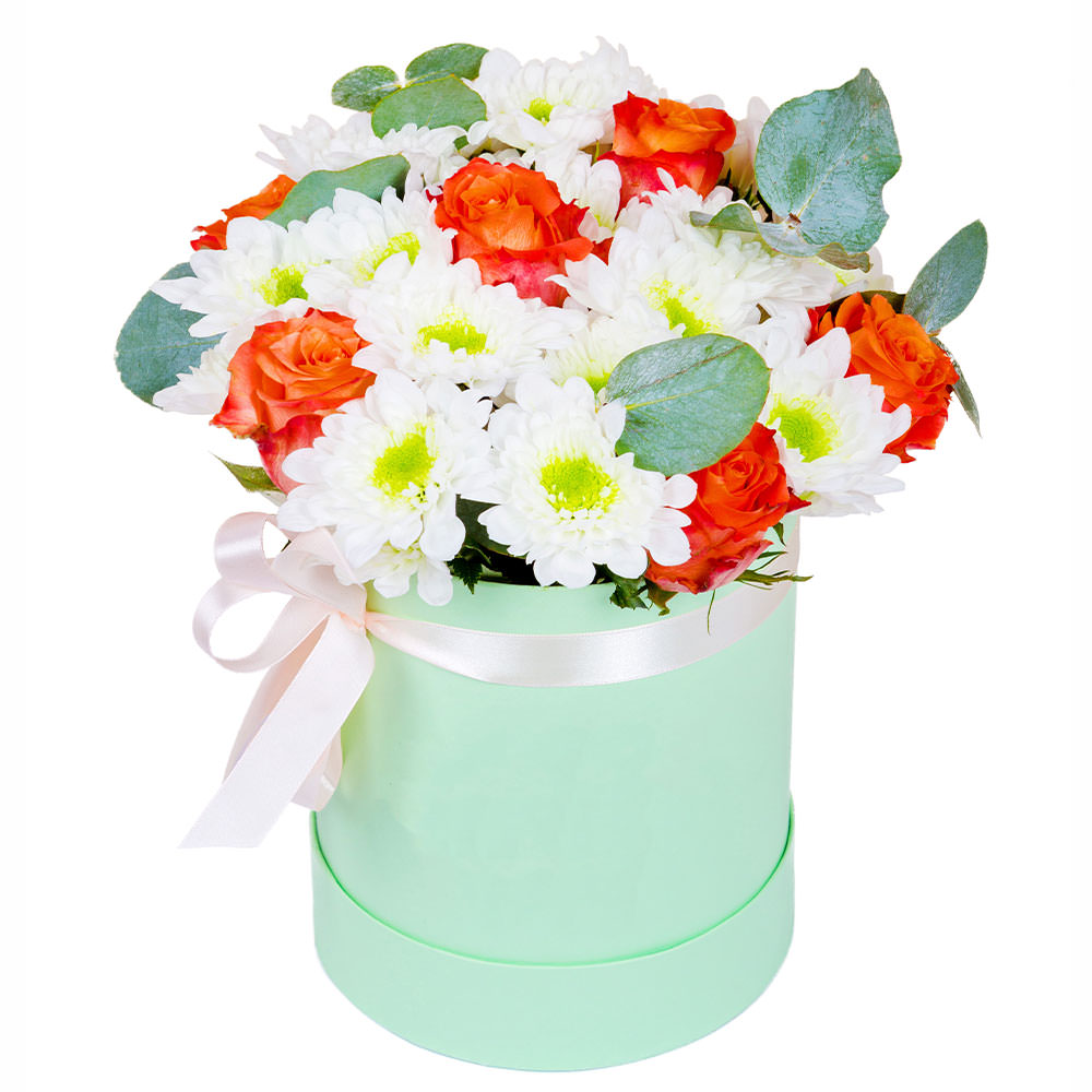 Хризантема кустовая, роза одноголовая, эвкалипт.